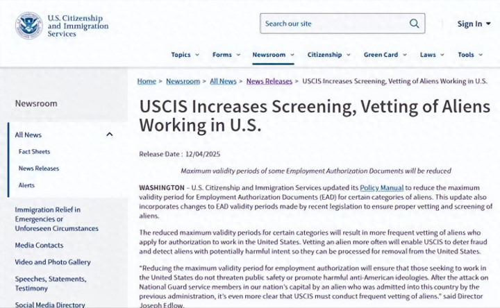 该新规将于12月5日起正式实施,适用于此后提交的所有EAD工卡申请,目前已提交但尚未获批的申请也将按此标准执行。