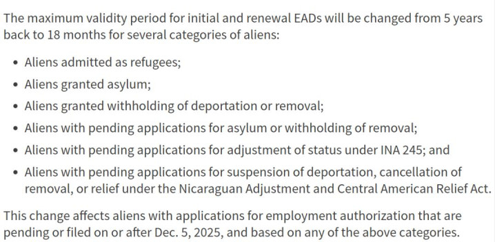 这意味着自2025年12月5日开始,相关申请人所获工卡有效期最长仅为18个月,之后需每一年半重新提交I-765表格、缴纳申请费、重新采集指纹并进入审批队列。